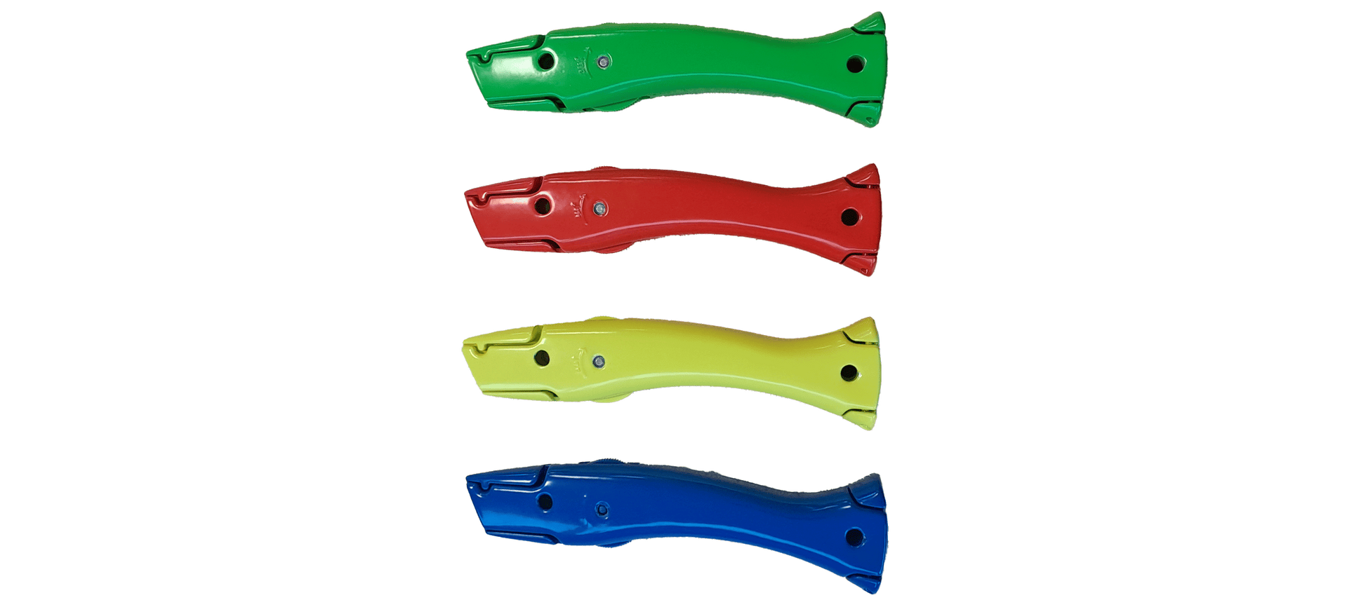 Het gecoate asfaltmes wordt geleverd inclusief houder. Leverbaar in de kleuren geel, rood, blauw en groen.